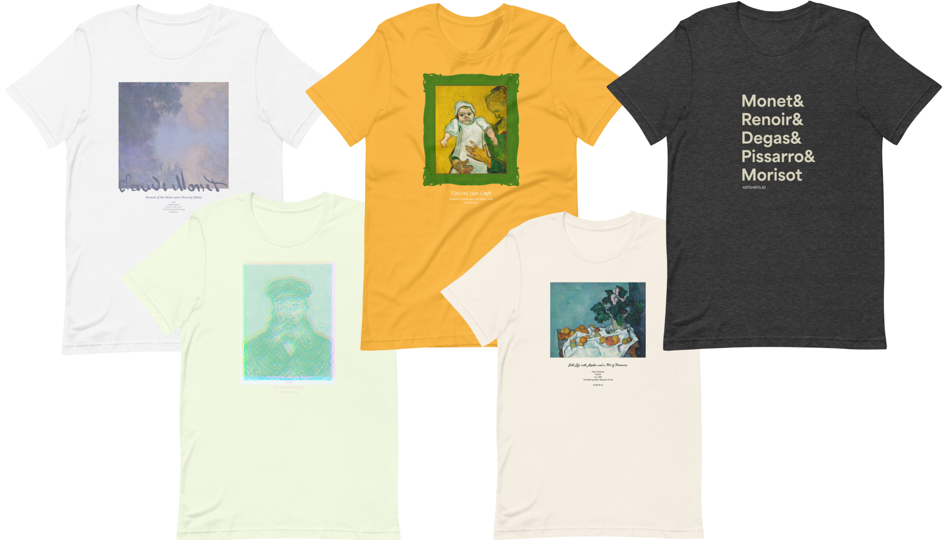 Slide 1 Slide 1 (current slide) Slide 2 Slide 2 (current slide) Featured Still Life with Apples and a Pot of Primroses Fitted T-Shirt $34.00 Van Gogh’s Sunflowers 1888 Boxy T-Shirt $45.00 The Thinker Boxy T-Shirt $45.00 Sunflowers at The Met Boxy T-Shirt $45.00 Wheat Field with Cypresses Fitted T-Shirt $34.00 Fuji from Gotenyama at Shinagawa on the Tōkaidō Boxy T-Shirt $45.00 Madame Roulin and Her Baby, 1888 Fitted T-Shirt $34.00 Self-Portrait of Paul Gauguin Gold Fitted T-Shirt $34.00 The Impressionists: Monet & Renoir & Degas & Pissarro & Morisot Fitted T-Shirt $34.00 The Great Wave (Under the Wave off Kanagawa) Fitted T-Shirt $34.00 Roses, 1890 Boxy T-Shirt $45.00 Van Gogh Irises 1890 Fitted T-Shirt $34.00 It’s Van Gogh season… NEWS Featured Oct 6, 2025 Want a free shirt? Oct 6, 2025 Oct 6, 2025 Sep 23, 2025 Artshirts.io is really going to happen Sep 23, 2025 Sep 23, 2025 These Monet shirts make an impression… Want a free shirt?Get details on our weekly shirt giveaway.